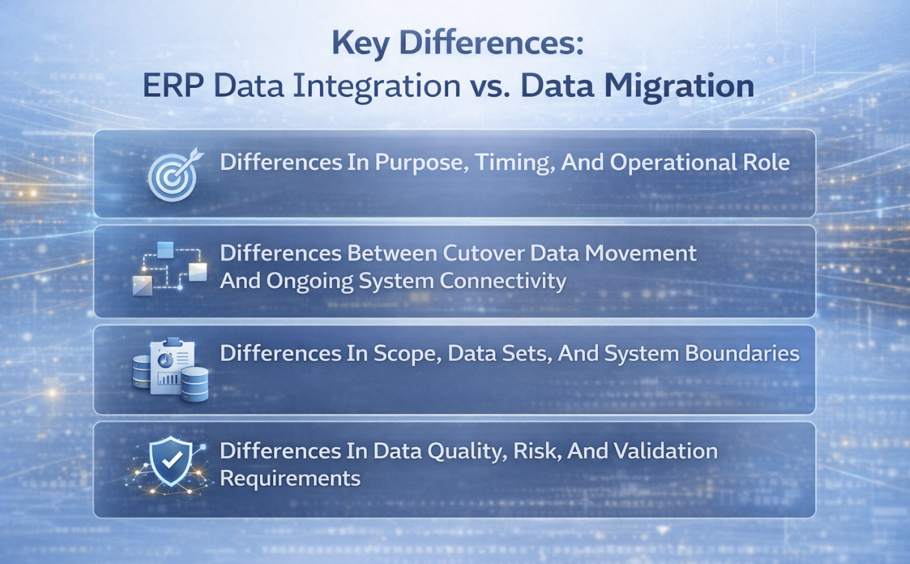 Purpose, timing, and system role show the clearest difference between data migration and data integration. In ERP work, they solve different problems and need different planning. Migration supports cutover into the new system. Integration supports ongoing data flow after go-live.
