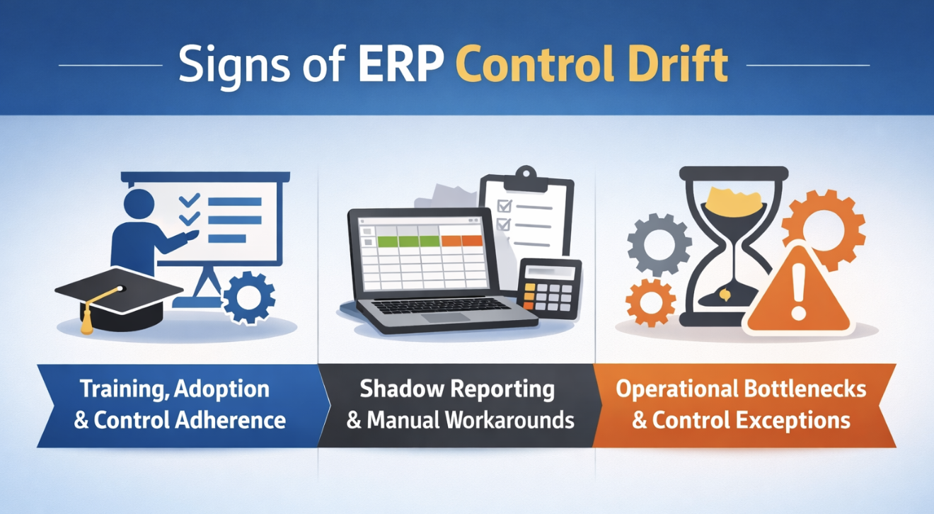 A documented control model can look strong while execution tells a different story. Reports may require spreadsheet adjustment before leaders trust them. Approvals may occur outside the ERP workflow. Access may have expanded beyond business needs. Those conditions reduce visibility and increase compliance and reporting risk.